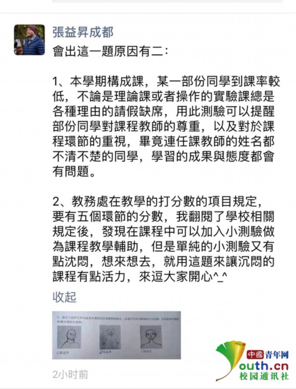 为什么老师会出这道题?记者采访后得知,临近构成课程结业,在他本人在翻阅了学校相关规定后,发现了可以在课程中加入小测验作为课程教学辅助,因此他就有了在考卷中出小测验的想法。