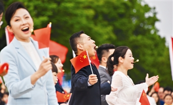 “我爱你中国,我爱你中国,我爱你中国;我爱你春天蓬勃的秧苗,我爱你秋日金黄的硕果;我爱你青松气质,我爱你红梅品格,我爱你家乡的甜蔗,好像乳汁滋润着我的心窝;我爱你中国,我爱你中国,我要把美好的青春献给你,我的母亲我的祖国……”在小提琴的伴奏下,在童声的领唱下,在机关青年的集体朗诵声中,现场数百名群众加入到了“快闪”的队伍中,大家饱含深情,齐声高唱,将对祖国的挚爱寄托在歌声中。