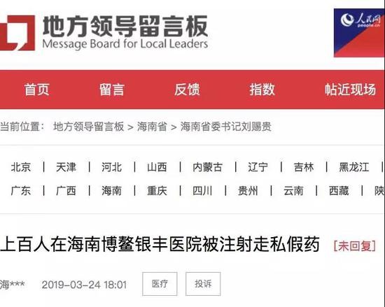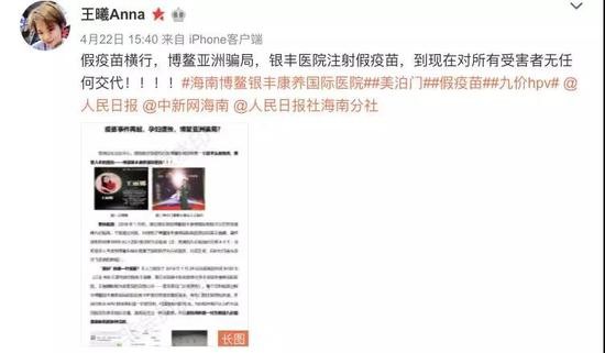 除了在人民网地方领导留言板上的举报,4月22日,还有微博网友@王曦Anna爆料,自己在海南博鳌银丰康养国际医院注射的九价HPV疫苗被认定为假疫苗。