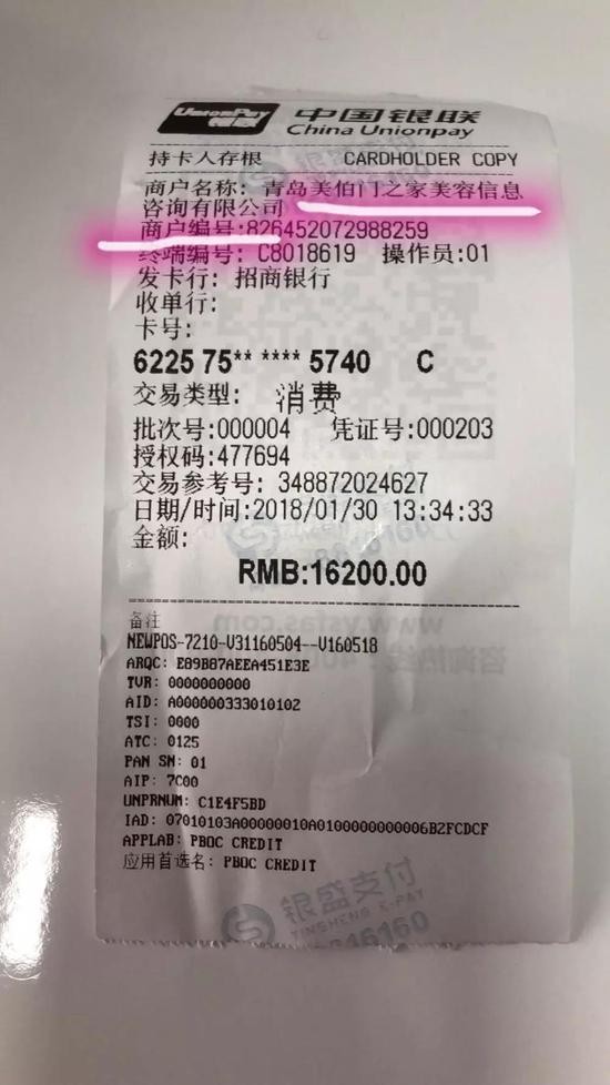 该举报人上传的图片中,一张银联支付单上的商户名称为:青岛美伯门之家美容信息咨询有限公司。另一张电子付款信息显示,收款人为:青岛即墨市承达加油站。