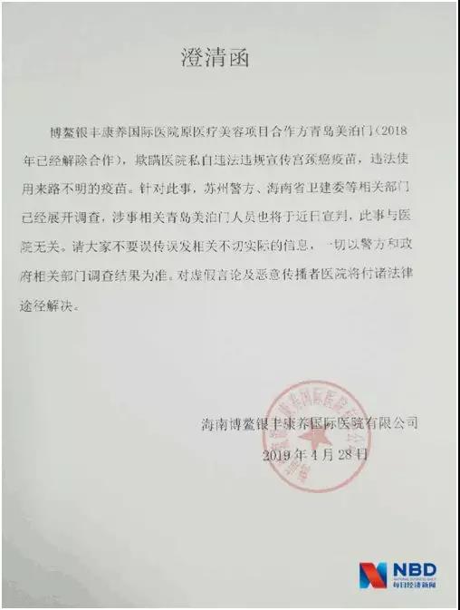 据《每日经济新闻》报道,一名受害人表示,银丰康养医院给他们发来一份澄清函,称原医疗美容项目合作方青岛美泊门(2018年已经解除合作关系),欺瞒医院私自违法违规宣传宫颈癌疫苗,违法使用来路不明的疫苗。