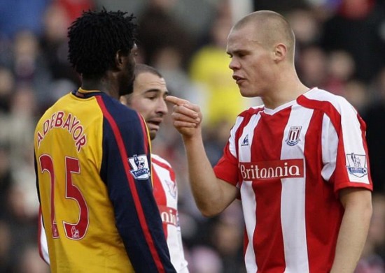 “温格是一名喜欢让球队踢得很漂亮的主教练,”阿德巴约回忆,“不论面对什么样的处境,我们都要踢出自己的风格来。我还记得去斯托克城的那些日子。他们有德拉普这样善于善于扔界外球的球员,很多球队都难以应付。我身材挺高大的,但球队的其他球员呢?当我们走出更衣室来到走廊的时候,你会听到对面传来了叮叮当当的声音,这些声音来自斯托克城球员球鞋上的鞋钉,我们只能去想,‘我的天啊’。肖克罗斯、胡特、克劳奇,再看看我们的球员,大概都是60公斤级的球员。”