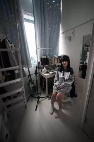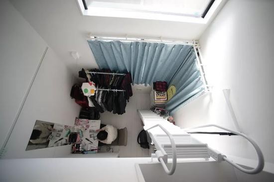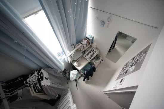 伊藤所住的是一间复式公寓,一层为生活区,包括厨房、卫生间、工作桌椅等;二层则是睡眠区,面积大约4.5平米,高度约为1.4米。两层之间由一个长长的白色梯子连接着。