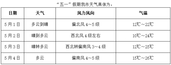 市气象部门根据监测到的气象资料分析,预计今年“五一”假日期间(5月1~4日)全市以晴好天气为主,气温适宜,空气质量良好,适宜出行。节后5日云系增多,局部伴有弱小雨天气。