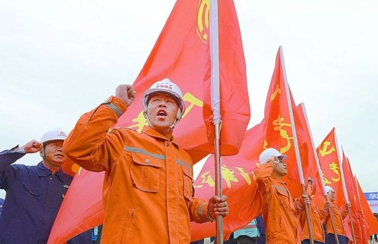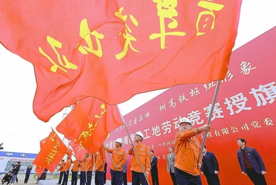 4月26日,一面面“党员突击队”“青年突击队”“工人先锋号”的旗帜在市铁路综合客运枢纽项目工地飘扬,建设工人庄严宣誓:奋战两百天,枢纽保运营。