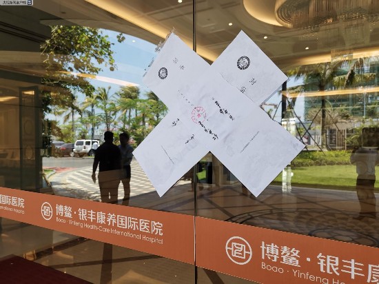 4月29日中午,记者在海南博鳌银丰康养国际医院看到,当地卫生监督部门工作人员正在医院贴封条,封条落款为琼海市卫生健康委员会。据了解,这家医院的医疗机构执业许可证已经被吊销。