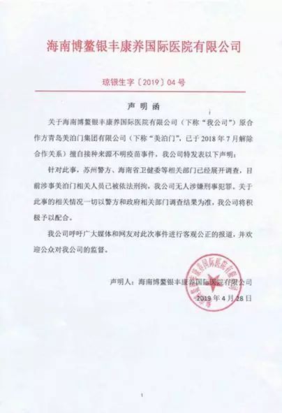 4月28日,海南博鳌银丰康养国际医院在官网发布关于该院和原合作方青岛美泊门集团有限公司(下称“美泊门”,已于2018年7月解除合作关系)擅自接种来源不明疫苗事的声明,内容如下: