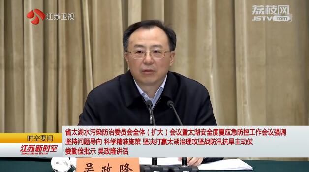 吴政隆在讲话中指出,太湖治理在全省乃至全国生态文明建设中地位重要、意义重大。要在充分肯定成绩的同时,清醒认识太湖治理已进入爬坡过坎攻坚阶段,形势依然十分严峻。我们要提高政治站位,树牢"四个意识",坚决做到"两个维护",深入贯彻习近平生态文明思想,全面落实新发展理念,进一步增强打好太湖治理攻坚战的责任感紧迫感。要坚持以习近平新时代中国特色社会主义思想为指导,坚持生态优先、绿色发展,坚持标本兼治、综合治理,坚持问题导向、突出重点,坚持精准治太、科学施策,以改善水质为核心,以控磷降氮为主攻方向,加大城乡生活污染治理,加强小流域综合整治,大力削减农业面源污染,加快实施生态修复重大工程,全力推动产业转型升级,提高科学治太水平,着力提升应急防控能力,努力实现更高水平"两个确保"。要压紧压实责任,深化河湖长制管理,强化环境执法监管,狠抓工作落实,以硬举措硬作风取得硬成效。当前,防汛工作进入临战状态,各地各部门要认真贯彻习近平总书记重要指示精神,按照党中央、国务院决策部署和省委、省政府工作安排,全面排查风险隐患,加强预测预报预警,科学调度,积极应对,坚决打好防汛抗旱防台风主动仗,确保人民群众生命财产安全。
