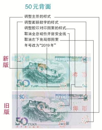 举例来说,新版50元纸币的变化,包括正面中部面额数字调整为光彩光变面额数字“50”、右侧增加动感光变镂空开窗安全线和竖号码等。