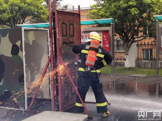 湖北宜昌三峡坝区消防特勤大队在进行破拆训练。(央广网记者 陈锐海 摄)