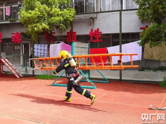 湖北武汉消防支队江汉中队在篮球场训练。(央广网记者陈锐海 摄)