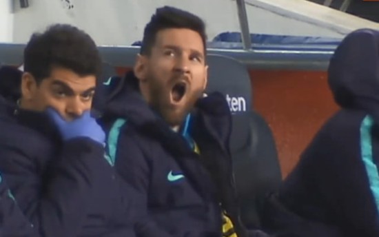 由于要备战欧冠半决赛,在上周末的西甲联赛中,巴尔韦德没有让梅西首发。巴萨在上半场占据优势,但迟迟未能破门。下半场伊始,巴尔韦德才派出梅西。然而梅西登场之前在干些什么呢?场边的转播镜头给出了答案。梅西与身边的教练不时交流,分享心得,梅西还抠抠鼻子。到后来,梅西居然还打了哈欠,然后一副慵懒地样子半躺在替补席上。