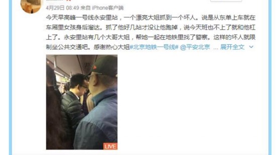 4月29日,有网友发微博称,在乘坐北京地铁一号线时,看到一位女生勇敢揪出色狼,并交给警方。网页截图