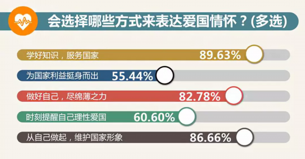 大学生表达爱国的方式更加务实,94.03%的受访者认为“理性爱国是最好的方式”。超过80%的大学生认为爱国要先从自己做起,“学好知识、服务国家”“做好自己,为社会尽绵薄之力”等成为很多大学生的首选。