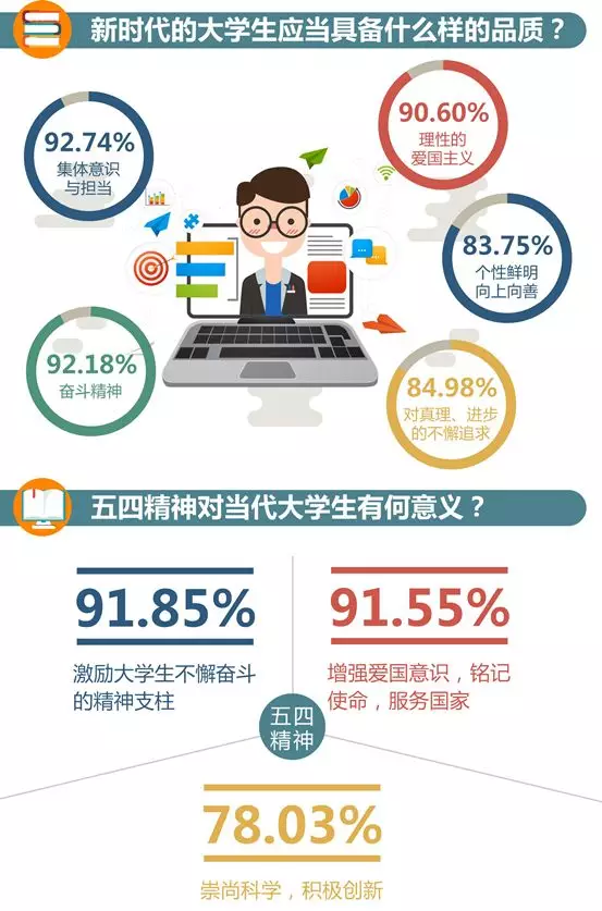 数据显示,98.79%的受访者认为“五四精神永不过时”,92.74%的受访者认为“新时代大学生应该具备集体意识与责任担当”,84.98%的受访者认为“大学生要坚持对真理、进步的不懈追求”。