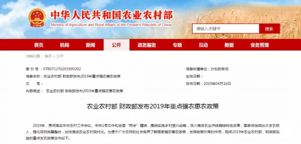 近日,农业农村部、财政部联合发布《2019年重点强农惠农政策》,这37条政策包含了农业生产发展和流通、农业资源保护利用、农田建设、农业科技人才支撑、农业防灾减灾、乡村建设等六大方面。