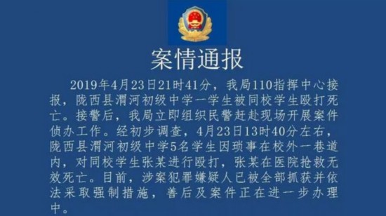 荔枝新闻讯 据陇西县公安局消息,甘肃省陇西县渭河初级中学一学生被同校学生殴打死亡,经警方初步调查,4月23日13时40分左右,陇西县渭河初级中学5名学生因琐事在校外一巷道内,对同校学生张某进行殴打,张某在医院抢救无效死亡。