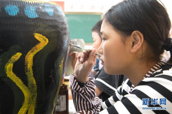 大陈实验学校的学生利用岛上的废弃陶罐作画(4月19日摄)。新华社记者 翁忻旸 摄