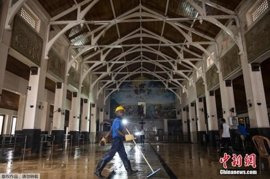 当地时间2019年4月27日,斯里兰卡科伦坡,在爆炸发生近一周之后,斯里兰卡政府第一次对教堂内部进行了全面的清理,有多辆卡车和消防车出动,以清理爆炸现场的碎片和血迹。
