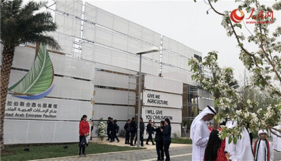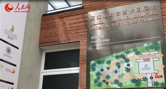 阿联酋馆馆长艾哈迈德·哈马迪向记者介绍了展馆的设计理念——用现代农业技术绿化沙漠。阿联酋展馆总面积1850平方米,在仿造Falaj灌溉系统搭建而成的潺潺流水旁,种植了36棵椰枣树以及146棵包括柠檬、木瓜在内的20多种阿联酋常见树木和5000多棵各类花草药材。观众还可通过馆内播放的记录短片了解阿联酋如何利用现代农业技术,从沙漠国家变为一方绿洲的历史演变和相关的文化传承。