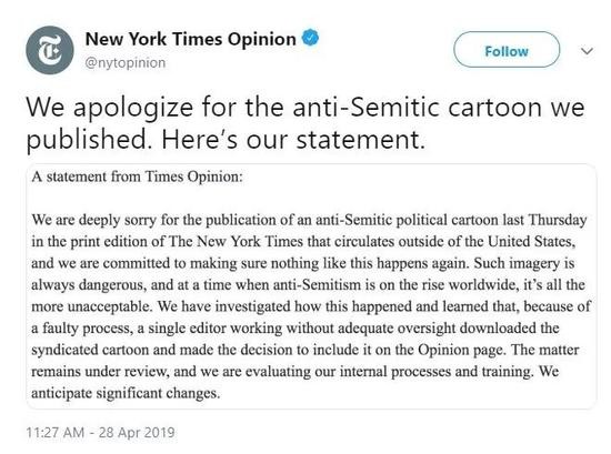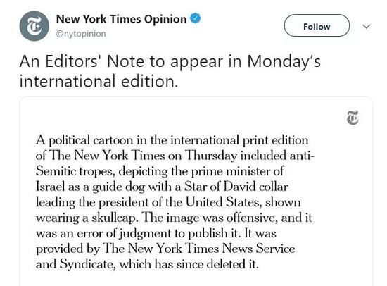 于是,《纽约时报》又赶忙发布了一份“悔意十足”的声明。在这份声明中,该报不仅“痛心疾首”地表示他们为“反犹卡通”[深表歉意](deeply sorry),并毫无保留地承认这种恶毒的“政治隐喻”确实是“危险的”、“不可接受”的;而相比之前推锅给合作方,该报此次又称是报社一名“单独的编辑”审核不严,错误地使用了合作方提供的一张卡通图片所致,报纸将汲取教训“严肃整改”。