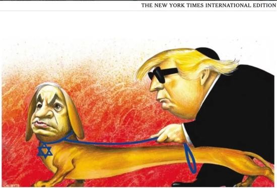 下面这张图,就是《纽约时报》引发众怒的那张讽刺特朗普和内塔尼亚胡的卡通。图中,特朗普被画成了一个身着犹太人传统服装的盲人,而内塔尼亚胡则被画成了一条“导盲犬”,疑似在讽刺特朗普在中东等政策上如同盲人一样被内塔尼亚胡牵着走。