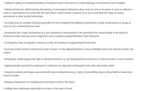 美国国务院甚至还对各种“反犹言论”进行了专门的定义,并列出多种属于“反犹言论”的情形,其中就包括“一切会妖魔化犹太人的阴谋论”,比如宣称犹太人在控制媒体、政府、经济和社会组织的言论;还包括“因为以色列的一些做法就让所有犹太人背锅”;“因为一个犹太人的错误行为,就对所有犹太人放地图炮”等等。