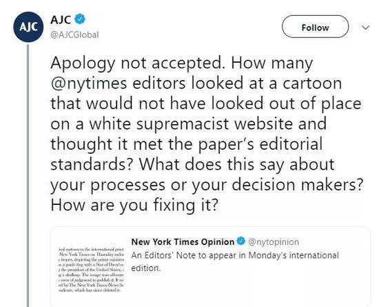美国犹太人的权威代表团体“美国犹太人协会”(AJC)就公开表示拒绝接受《纽约时报》这种态度的道歉,并要求《纽约时报》必须严肃调查此事,查清责任,落实到具体的人,以及拿出整改措施。
