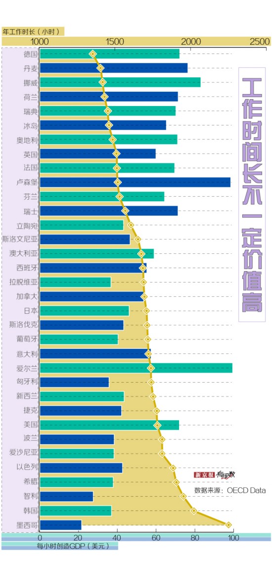 通过整理 OECD (经合组织)各国相关数据我们发现,工作时长和生产力似乎真的不成正比。有些工作时间长的国家,每小时劳动所创造的 GDP 反而更低。