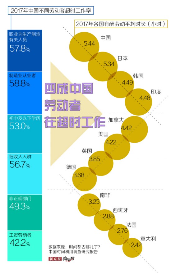 据《时间都去哪儿了?中国时间利用调查研究报告》,2017 年中国工资劳动者超时工作相当普遍,有 42.2% 的劳动者每天工作时间大于 8 小时;其中,制造业从业者的情况最为严重,接近六成从业者每天超时工作。