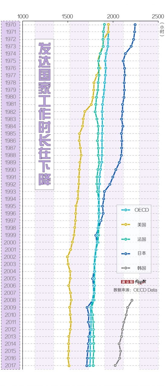 以我们的邻国日韩为例,1970 年日本人年工作时长为 2243 小时,跟现在中国人的工作时长差距不算太大,可到了 2017 年日本人的年工作时长已经降到了 1710 小时;2008 年韩国人年工作时长为 2209 小时,到 2017 年下降到 2024 小时。