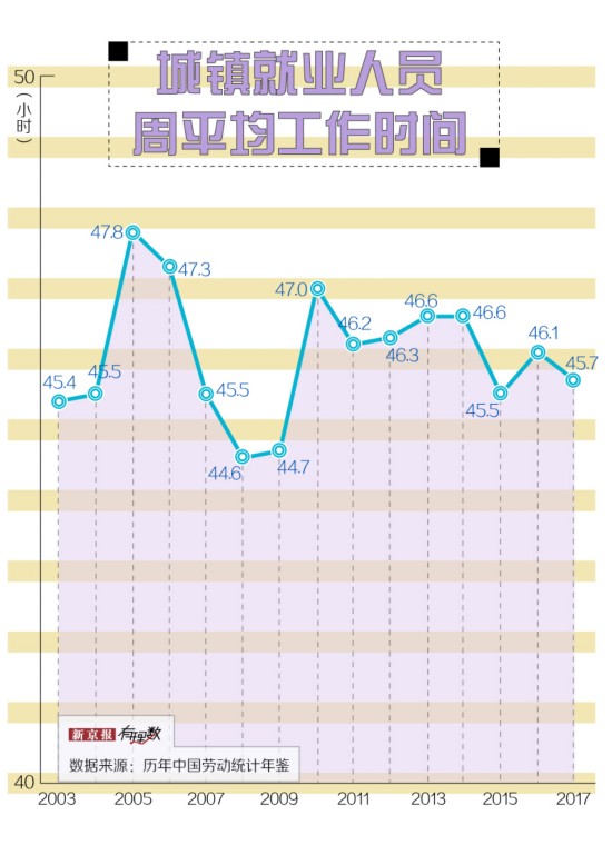 但事实上,我们都“违法”了。梳理历年《中国劳动统计年鉴》可以发现,近十几年来,中国城镇就业人员周平均工作时间,没有一年是低于 44 小时上限的。