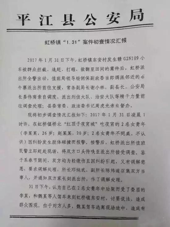 新京报快讯 据湖南省平江县委宣传部官方微信消息,近日,有微信聊天群相继转载一段砸车视频和文字称,一江西游客到平江县石牛寨景区旅游时遭当地群众殴打砸车,对平江县旅游形象造成严重影响。经调查核实,此事属网络谣传。视频内容实为2017年1月31日下午,虹桥镇东安村发生的一起群体性冲突,并非网传的“江西游客到石牛寨景区旅游时遭砸车”。该案件已由公安部门及时依法进行处理,并向社会通报。