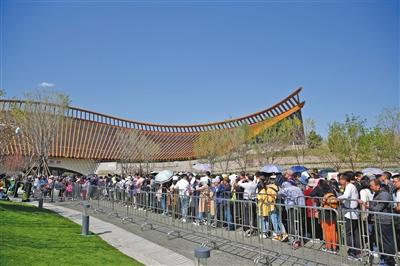 昨日,五一小长假第一天,世园会迎来开园后的首个客流高峰。图为当日下午三时许,中国馆前排队的游客。新京报记者 侯少卿 摄
