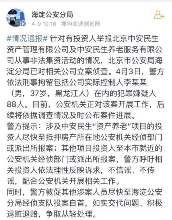 “2月底有一笔理财到期后,他们也没有返还本金,这时候就感觉出事了。”刘婷的预感很快被证明是准确的。4月9日,北京市公安局海淀分局官方微博通报称,针对有投资人举报北京中安民生资产管理有限公司及中安民生养老服务有限公司从事非法集资活动的情况,北京市公安局海淀分局已对相关公司立案侦查。