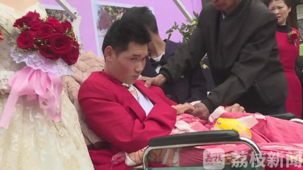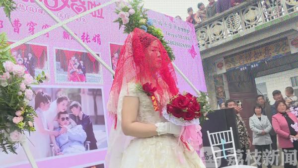 在众多前来观礼的亲朋好友的祝福下,身着一袭白纱的张娟缓缓移步台上,至今仍然没有自主意识的丈夫曹穿穿被家人用轮椅推到了张娟的身边。这场特殊的婚礼,没有繁杂的程序,没有新郎与新娘爱的誓言,却让在场所有人感动。