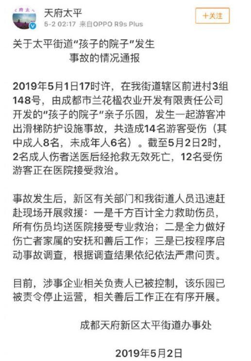 @中国之声 5月2日报道,5月1日,小长假的第一天,位于成都天府新区太平镇的一家名为“孩子的院子”的游乐园,发生了一起游客冲出滑梯防护设施事故。事故造成2名成人伤者送医后抢救无效死亡,其他12名受伤游客正在医院接受救治。目前,涉事负责人已被控制,游乐场已暂停营业。