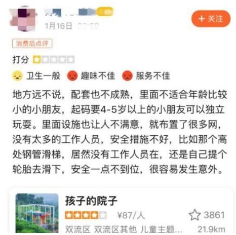 实际上,网上关于孩子的院子的质疑有不少,某知名点评网站上就有不少差评,设备简陋、安全人员不到位、项目危险度高等三项质疑频繁出现。5月1日上午的时候,该网站还能打开看到跟“孩子的院子”相关的购买信息和评论,到下午的时候,该网站跟“孩子的院子”乐园相关的信息全部删除了,无法打开。
