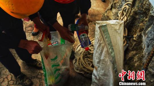 为了能够保障安全,每次拾捡垃圾时,吴长平四人都是分工合作,一人在悬崖下拾捡垃圾,两人就在栈道上收放绳子,为队友紧紧拉着“生命绳”,而另外一人则在一旁指挥。通过2年的配合,这个团队已经有了很高的默契度。