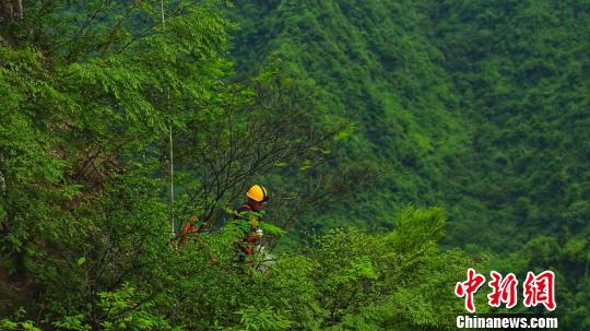 朱砂古镇悬崖栈道清洁小组组员在悬崖上捡垃圾。