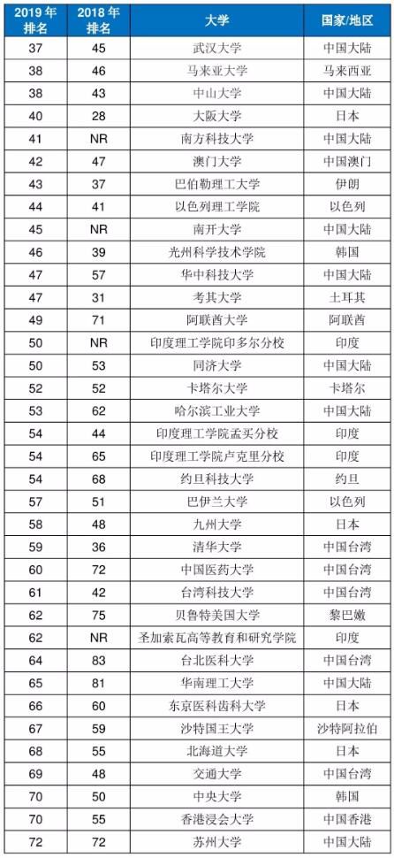 中国香港和中国台湾各有6所和32所大学进入榜单。澳门大学名列第42位。