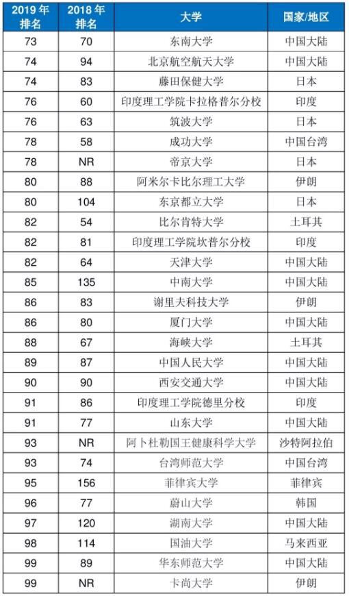 2019年泰晤士高等教育亚洲大学排名前100位的大学