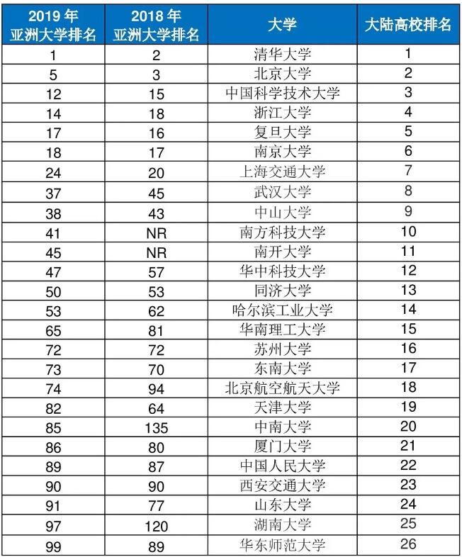 中国大陆高校进入2019年泰晤士高等教育亚洲大学排名前100名的名单