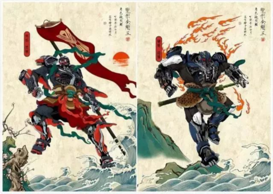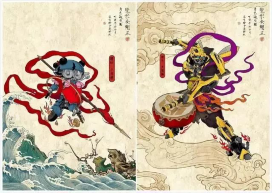 一个是脚踩风火轮的中国古代神话人物,一个是钢筋铁骨的欧美动画片科幻角色。