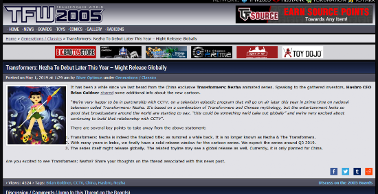 据海外最大的变形金刚社交网站“TFW2005”5月1日发布的公告,由中央电视台与美国孩之宝公司合拍的一部名为《变形金刚:哪吒》的动画作品,预计将于今年第三季度在央视黄金档首播。