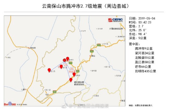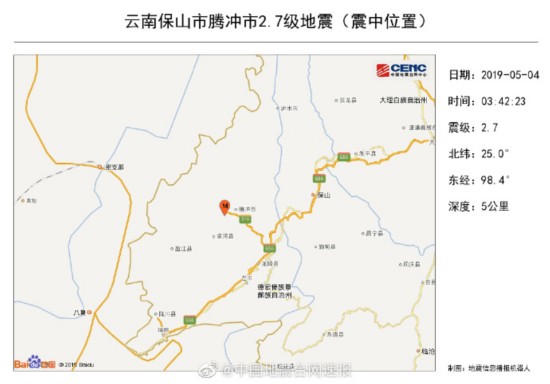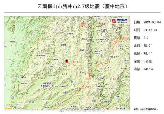 据“中国地震台网速报”微博消息:今日凌晨3时42分在云南省保山市腾冲市发生了一次地震,计算机自动测定的震级为2.7级,部分网友反馈说当地有感。