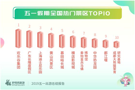 《报告》显示,主题乐园、文化古迹、动植物园、山水名胜等类型景区最受欢迎。从驴妈妈平台预订数据来看,欢乐谷集团、广东长隆度假区、上海迪士尼乐园、黄山风景区、慕田峪长城、横店影视城、秦始皇兵马俑博物馆、中华恐龙园、都江堰、成都大熊猫繁育研究基地等预订人气高,位列五一假期全国十大热门景区。