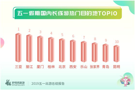 自2008年取消七天长假以来,今年五一实为最长的假期。相比以往,今年更多人选择拼假长线出游。《报告》显示,三亚、丽江、厦门、桂林、北京、西安、乐山、张家界、青岛、昆明,位居国内长线游目的地前十。