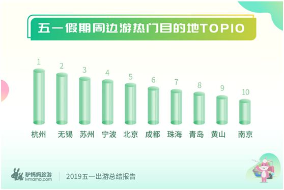 《报告》显示,五一期间,周边游依然是最受喜爱的出游类型,“1-3天”周边游人次占比超六成。其中, 3天2晚、2天1晚的中高档线路尤其受欢迎。杭州、无锡、苏州、宁波、北京、成都、珠海、青岛、黄山、南京等,位居十大热门目的地。