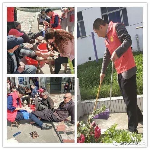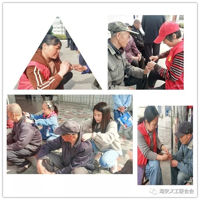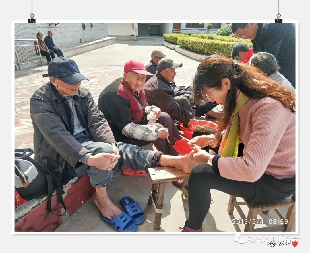 今天还有一位给我们带来惊喜和感动的义工,她叫吴利存。一开始我们不是一直在担心没有义工会给老人们修脚吗?正在带领小朋友的我,突然发现了一个美女正在给老人修脚:一把小椅子自己坐着,一张小凳子老人翘着脚。看她那娴熟地技艺,我以为她是做足疗的,一问,她说她是华艺服饰的。她手边一把修脚刀、一把剪灰指甲的剪刀、一把普通的小剪刀,就这样一直忙到活动结束。临走前,我握着她的手说:今天真的太谢谢你了!她客气地说没什么。
